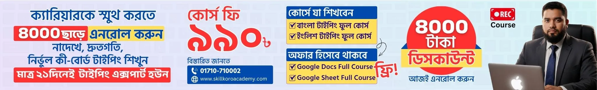অফিসে ধীর টাইপিং মানে রিপোর্ট, ইমেইল বা ডাটা এন্ট্রিতে সময় নষ্ট ও কাজের চাপ বেড়ে যাওয়া। দ্রুত ও নির্ভুল টাইপিং শুধু আপনার কাজের গতি বাড়াবে না, বরং বসের কাছে আপনার ভ্যালুও বাড়াবে। ডিজিটাল যুগে এই স্কিল থাকলে বর্তমান চাকরি হোক বা ভবিষ্যতের সুযোগ—সবখানেই আপনি এগিয়ে থাকবেন।